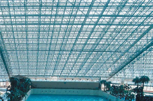 由多根桿件按照一定的網格形式通過節點連結而成的空間結構。具有空間受力、重量輕、剛度大、抗震性能好等優點;可用作體育館、 影劇院、展覽廳、候車廳、體育場看臺雨篷、飛機庫、雙向大柱 網架結構距車間等建筑的屋蓋。缺點是匯交于節點上的桿件數量較多,制作安裝較平面結構復雜。